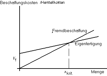 Eine weitere Fragestellung ist, ob man den Bedarf durch Eigenfertigung oder Fremdbeschaffung deckt. Dabei ist die Eigenfertigung meist aufgrund der Fixkosten Kf bis zu einer best. Menge xkrit teurer als die Fremdbeschaffung, danach dann günstiger: