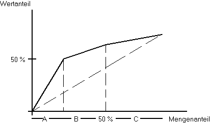 Die Ergebnisse der ABC-Analyse lassen sich auch in der Lorenzkurve veranschaulichen: