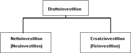 Unter Investition verstehen wir die Verwendung von finanziellen Mitteln zur Beschaffung von Sachvermögen, immateriellem Vermögen oder Finanzvermögen, d. h. die Beschaffung von Potentialfaktoren. (Maschinen, Vorräte, Patente, Lizenzen, Wertpapiere, Beteiligungen, Weiterbildung von Mitarbeitern, Forschung und Entwicklung)