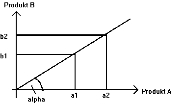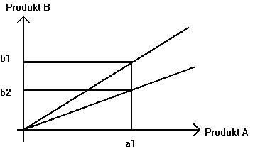 Das SubstiitutionsgebietDie Isoquanten haben in der Regel einen zum Ursprung konvexen Verlauf. Sobald sie sich mit zunehmender Einsatzmenge wieder vom Ursprung entfernen, ist die Substitution nicht mehr sinnvoll, da jetzt bei gleichbleibendem Ertragsniveau die Einsatzmengen beider Faktoren erhöht werden müssten. Somit wird das Gebiet, in dem eine Substitution sinnvoll ist (Substitutionsgebiet) von den Linien A und B beschränkt, die die Punkte der Indifferenzkurven verbinden, an denen deren Tangenten parallel zu den Achsen verlaufen.